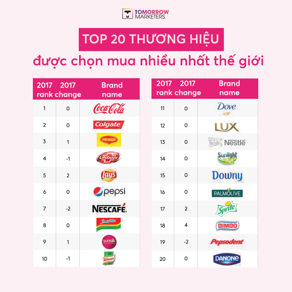 Hàng ngày chúng ta tiêu dùng hầu hết loại sản phẩm, nhà cung cấp. Trong số đó với các nhãn hiệu ta chỉ dùng lần đầu rồi không bao giờ dùng lại, với các nhãn hiệu ta dùng sản phẩm của họ hàng ngày và nhãn hiệu đó phát triển thành khôn cùng thân thuộc có mọi dân chúng Việt Nam. Sau đây là danh sách các nhãn hiệu đa dạng, được phổ biến người biết đến nhất Việt Nam theo nghiên cứu của tập đoàn Kantar Worldpanel.